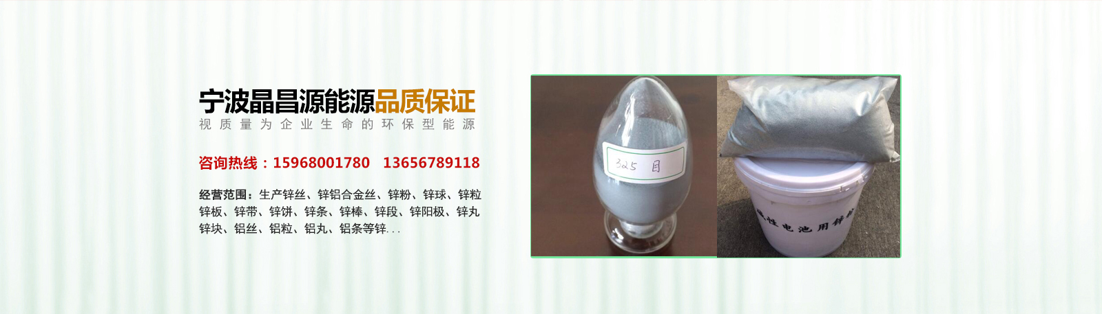 寧波晶昌源能源有限公司位于寧波市北侖區(qū),公司視質(zhì)量為企業(yè)的生命,嚴(yán)格執(zhí)行行業(yè)標(biāo)準(zhǔn)和國(guó)際標(biāo)準(zhǔn),鋅制品采用葫蘆島鋅業(yè)股份有限公司生產(chǎn)的0#蒸餾鋅錠,鋁制品采用AL00鋁錠作為原材料,生產(chǎn)鋅絲、鋅鋁合金絲、鋅粉、鋅球、鋅粒、鋅板、鋅帶、鋅餅、鋅條、鋅棒、鋅段、鋅陽(yáng)極、鋅丸、鋅塊、鋁絲、鋁粒、鋁丸、鋁條等鋅、鋁制品及鋅基合金、鋅鋁異形材。其中主導(dǎo)產(chǎn)品鋅絲11000噸/年,鋅鋁合金絲3200噸/年,鋁絲5300噸/年,鋅球6000噸/年,鋅粒5500噸/年,鋅粉10000噸/年以上...